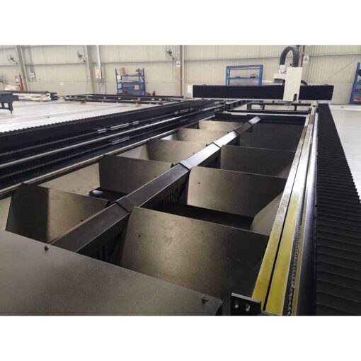 12,000 Watt 5′ x 10′ WIND Series IPG Fiber Laser Cutter fully enclosure with hydraulic shuttle table Features:
