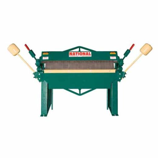 8′ x 16ga New National Box & Pan Brake Model U9616 has four popular floor model box and pan brakes designed to be easy and simple to operate. Standard with 2”, 3” and 4” finger widths, stop rods for repeat bends, two large counterweights, and precision bearings on the apron. All steel body construction with extra heavy tie rods for minimum deflection.