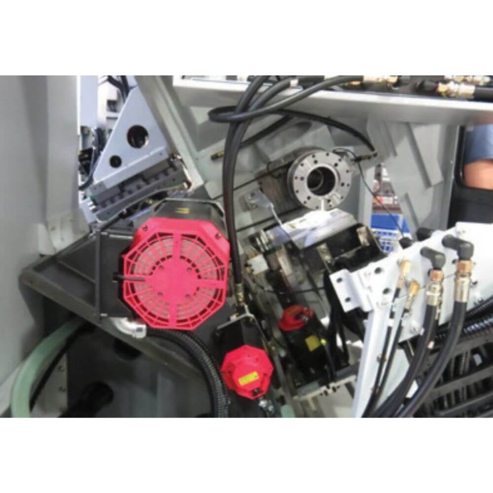 - Oversized Wide Set Heavy Duty Linear Guideways: Standard on all axes for extra heavy loading. Separate rail systems are provided for the upper and lower turrets, carriage and secondary spindle. Linear ways produce minimal fraction for: